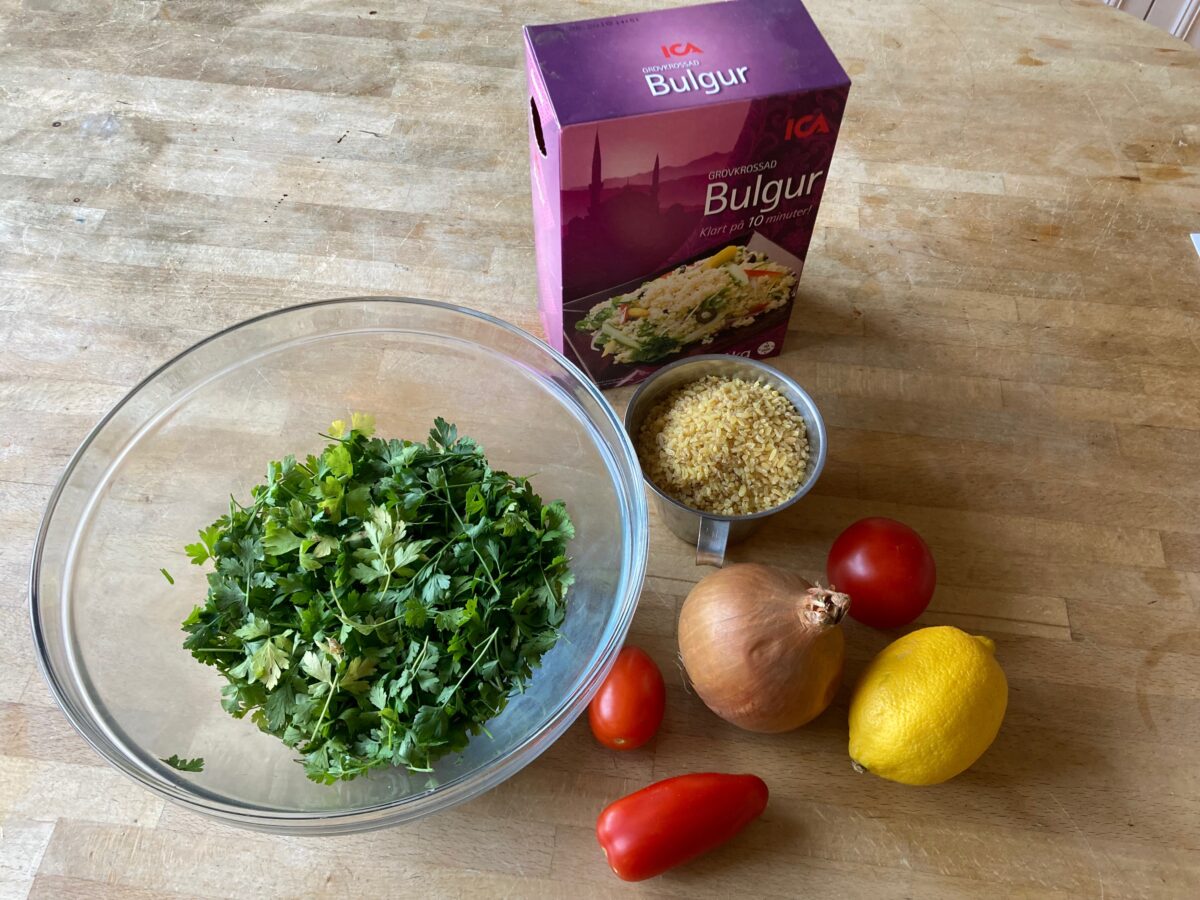 Tvätta en knippe persilja som finhackas. liksom tomater och en stor gul lök.