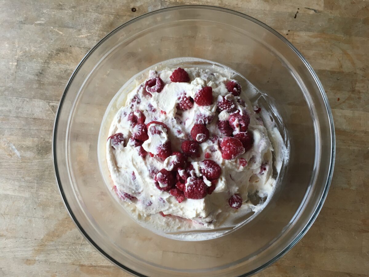 Vispa grädden. Vänta till hallonen är ”aufgetaut” (Google translate säger ”tinade”?). Blanda allt ihop och ställa i kylskåpet… ta tillräcklig hallon då blir det godaste 😉 man måste inte men man kan sockra efterrätten lite grann.