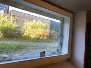 Övrigt eventuellt kittkladd/olja på glaset låter vi vara kvar tills vidare – det tar man lämpligen bort med rakbladsskrapa i samband med rengöring/puts när fönstren är färdigmålade.