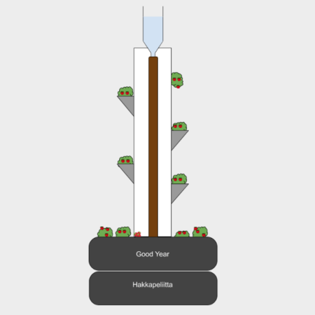 Denna jordgubbsbjörk består av en botten av 2 kasserade däck, i mitten sätts ett avloppsrör som vi målar med linoljefärg. I röret kommer vi att borra hål för att kunna plantera plantor, som ev vilar på en enkel pinne.